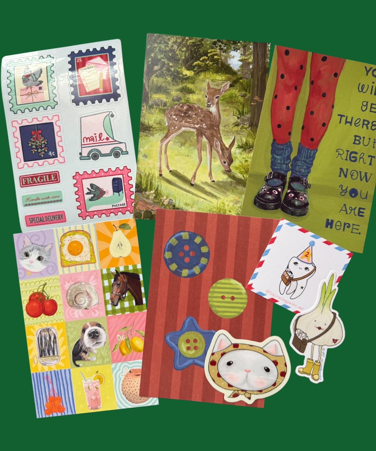 10 perfectly imperfect items from my studio: misprinted postcards, old business cards, overstock, etc. - Sticker sheets count as 3 items!